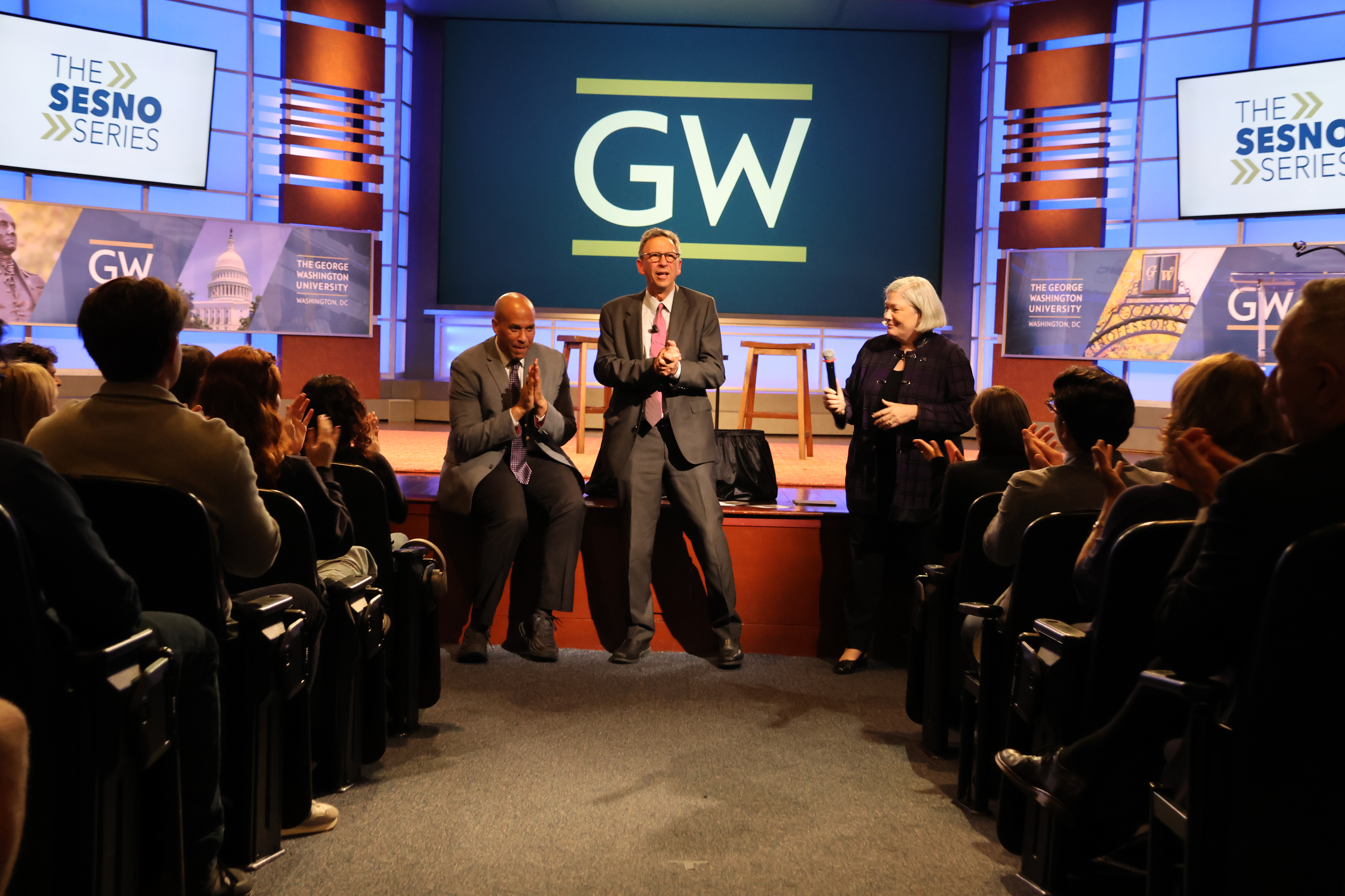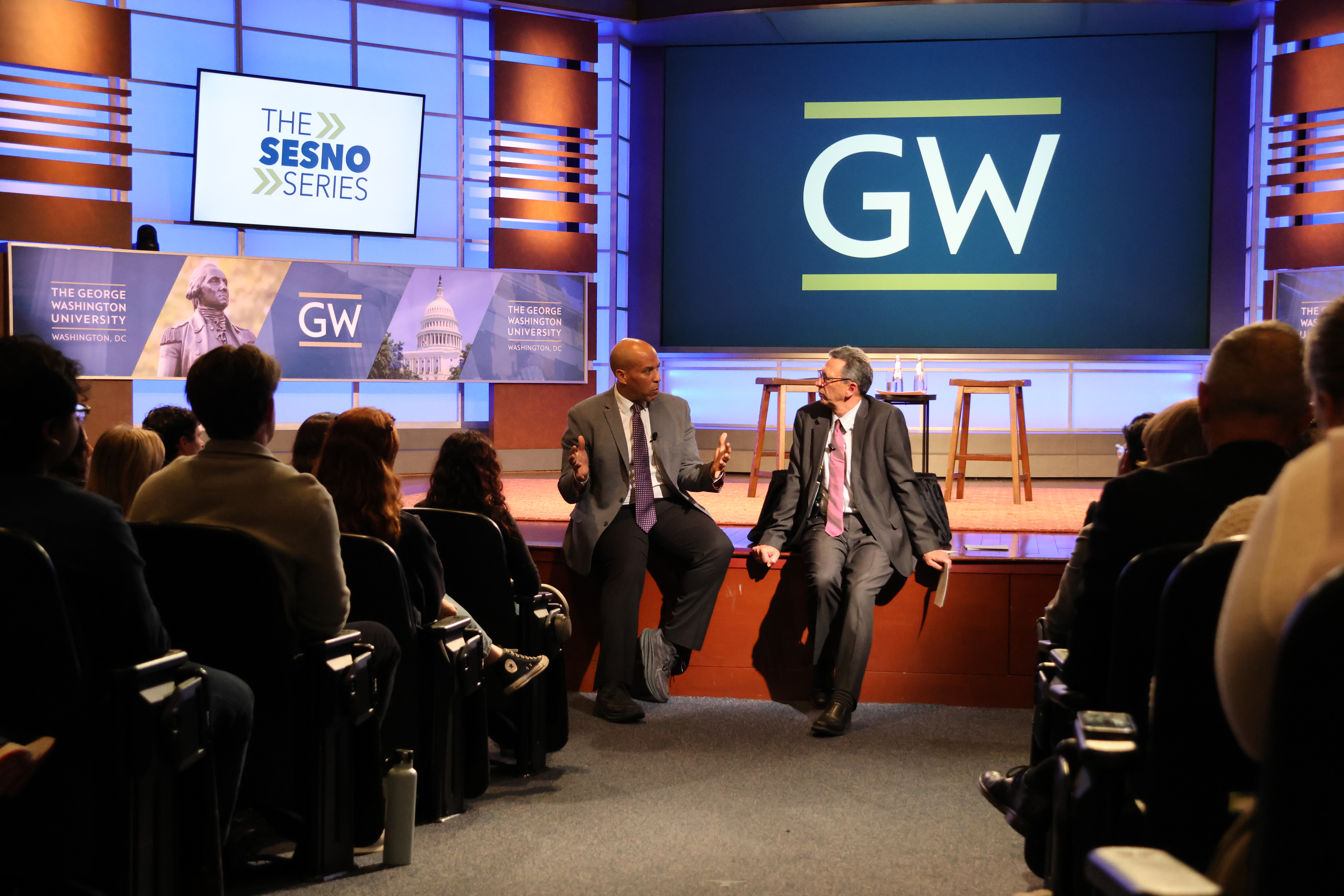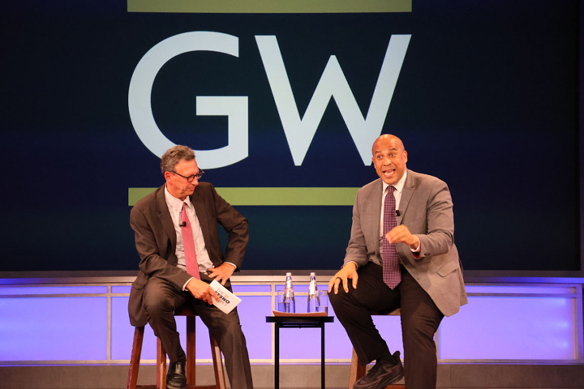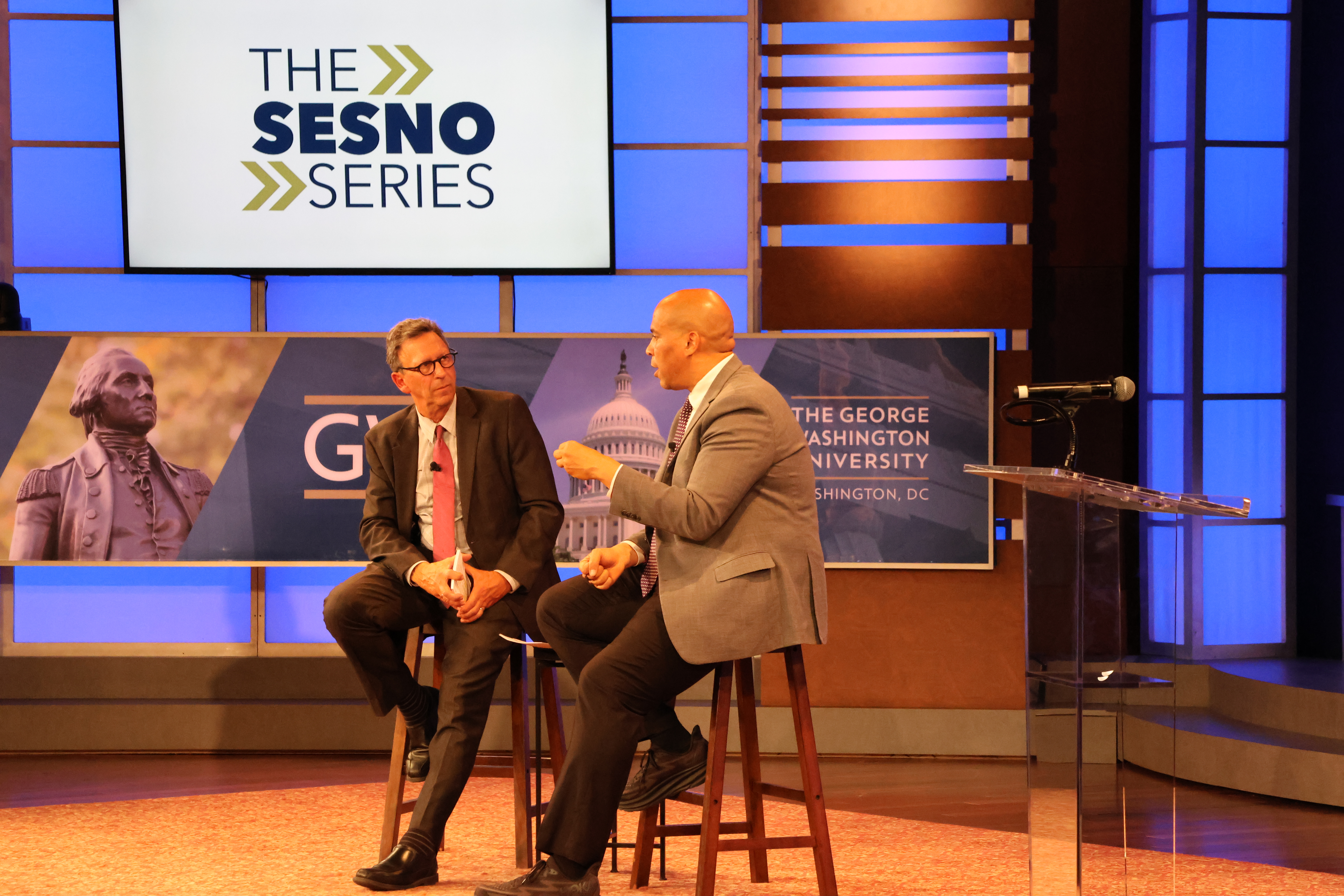 The first ever Sesno Series event, A House Divided: How to Survive our Polarized Times, A Conversation with Cory Booker, was held in September 2023. Frank and Senator Booker had an inspirational discussion on the state of our democracy and the night also featured clips from an enlightening GW student focus group led by renowned pollster Frank Luntz. Be sure to check out the recording of the event, a gallery of photos, and the student focus group clips below.