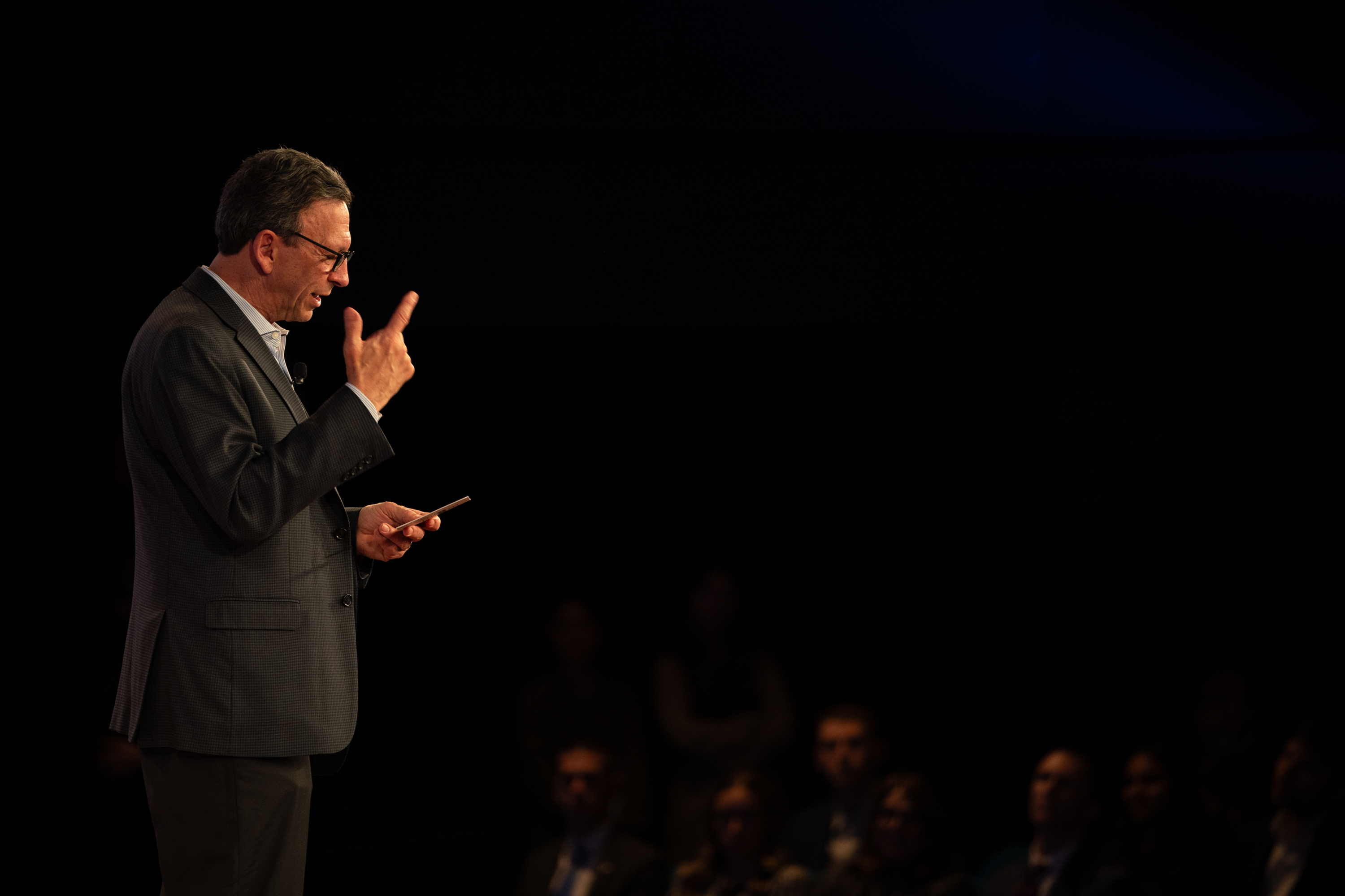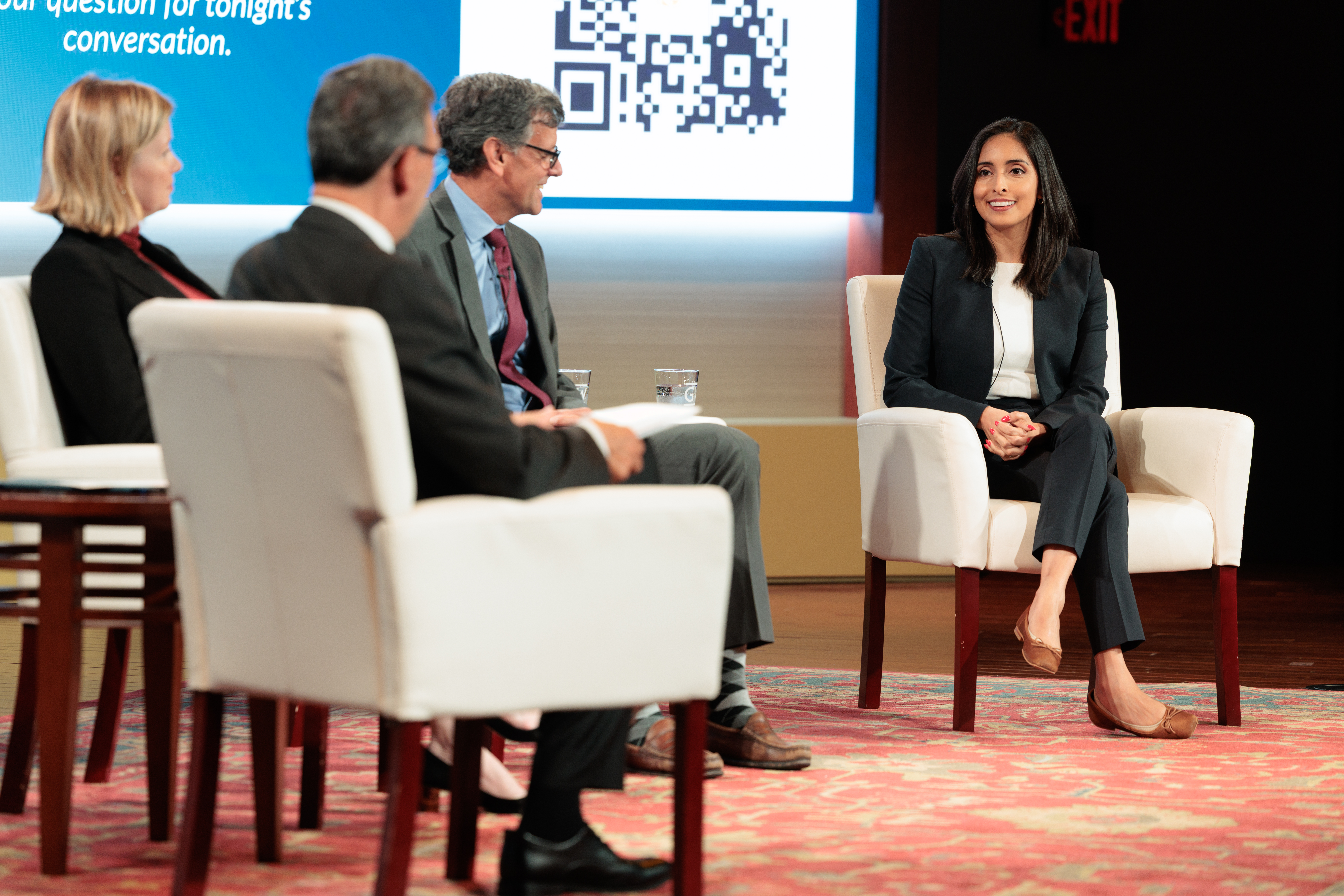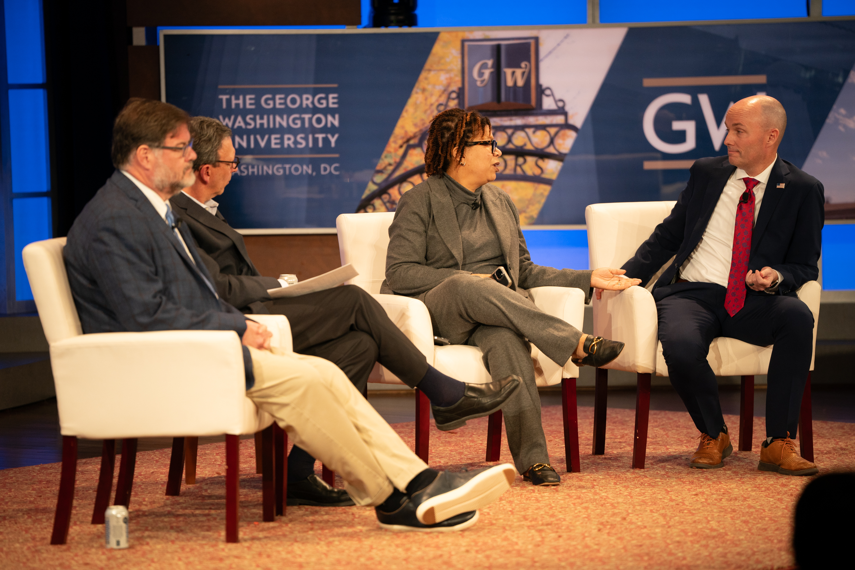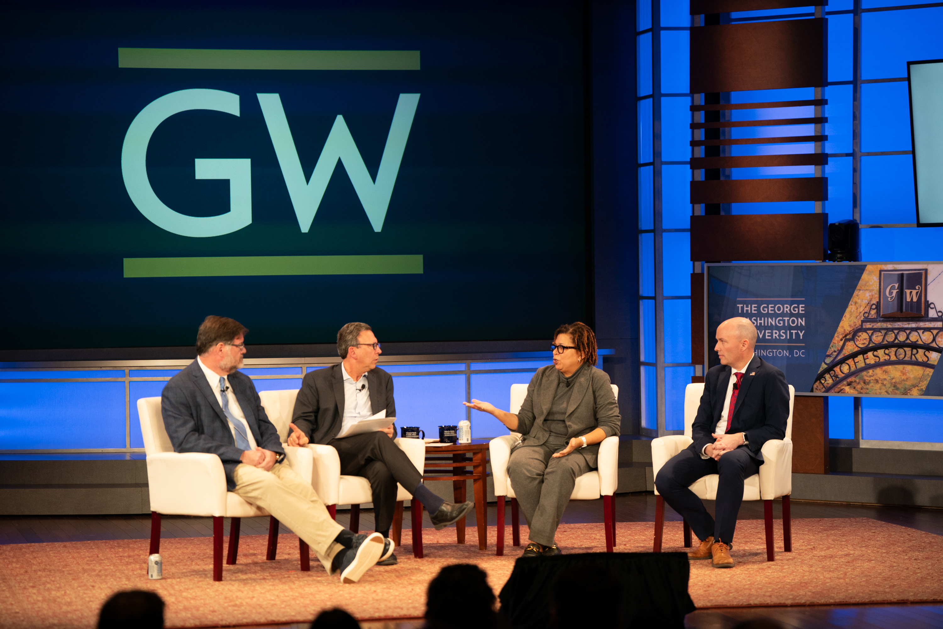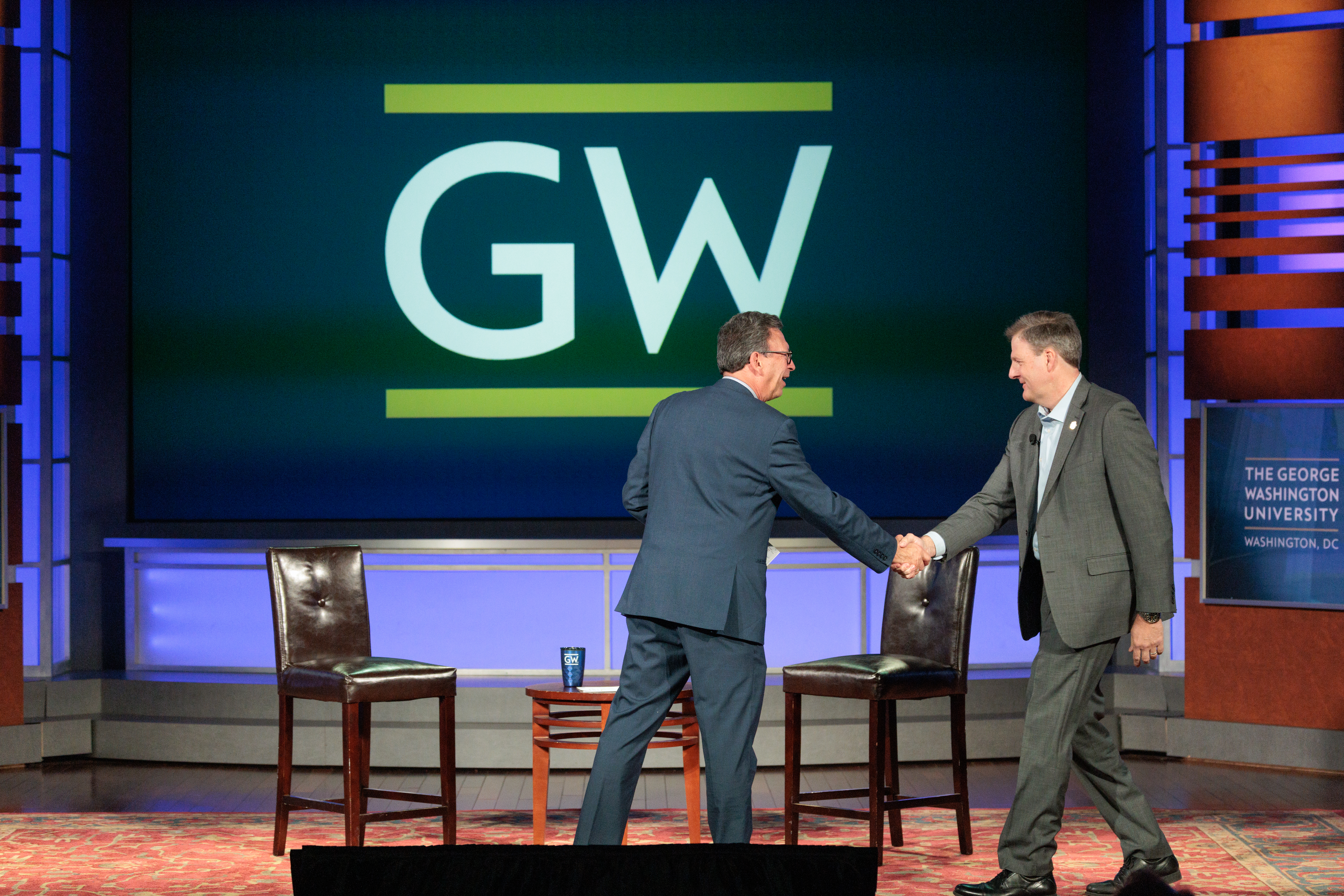 U.S. Sen. Mark R. Warner, D-Va., B.A. ’77, joined the event later, as he was delayed due to voting in the Senate.